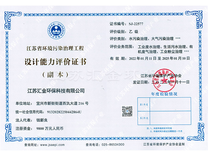 江蘇省環(huán)境污染治理工程設(shè)計(jì)能力評(píng)價(jià)證書